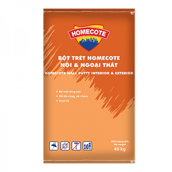 Bột trét Homecote Nội & Ngoại Thất của TOA là sản phẩm bột bả đa năng giúp làm phẳng mịn bề mặt tường xi măng, vữa, thạch cao cho cả trong nhà và ngoài trời, tạo bề mặt láng mịn, dễ xả nhám, có độ bám dính tốt, kinh tế. Mang lại bề mặt láng mịn, giúp sơn lên màu chuẩn và đẹp hơn.
